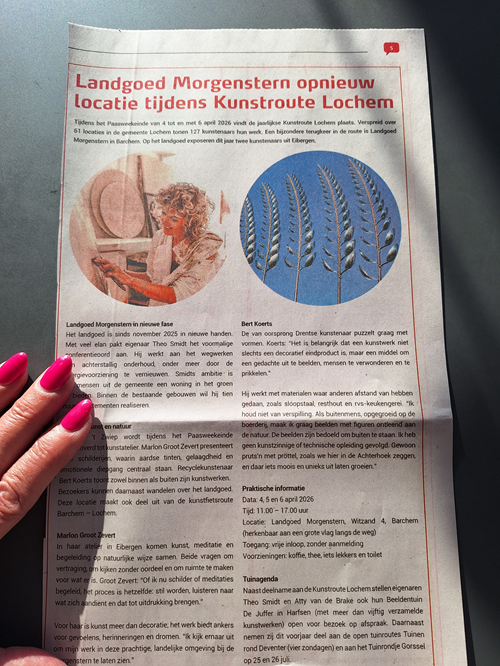 kunstroute lochemTijdens het Paasweekeinde van 4 tot en met 6 april 2026 vindt de jaarlijkse Kunstroute Lochem plaats. Verspreid over 61 locaties in de gemeente tonen 127 kunstenaars hun werk. Terug van weggeweest in de route is landgoed Morgenstern in Barchem, waar dit jaar twee kunstenaars uit Eibergen exposeren.